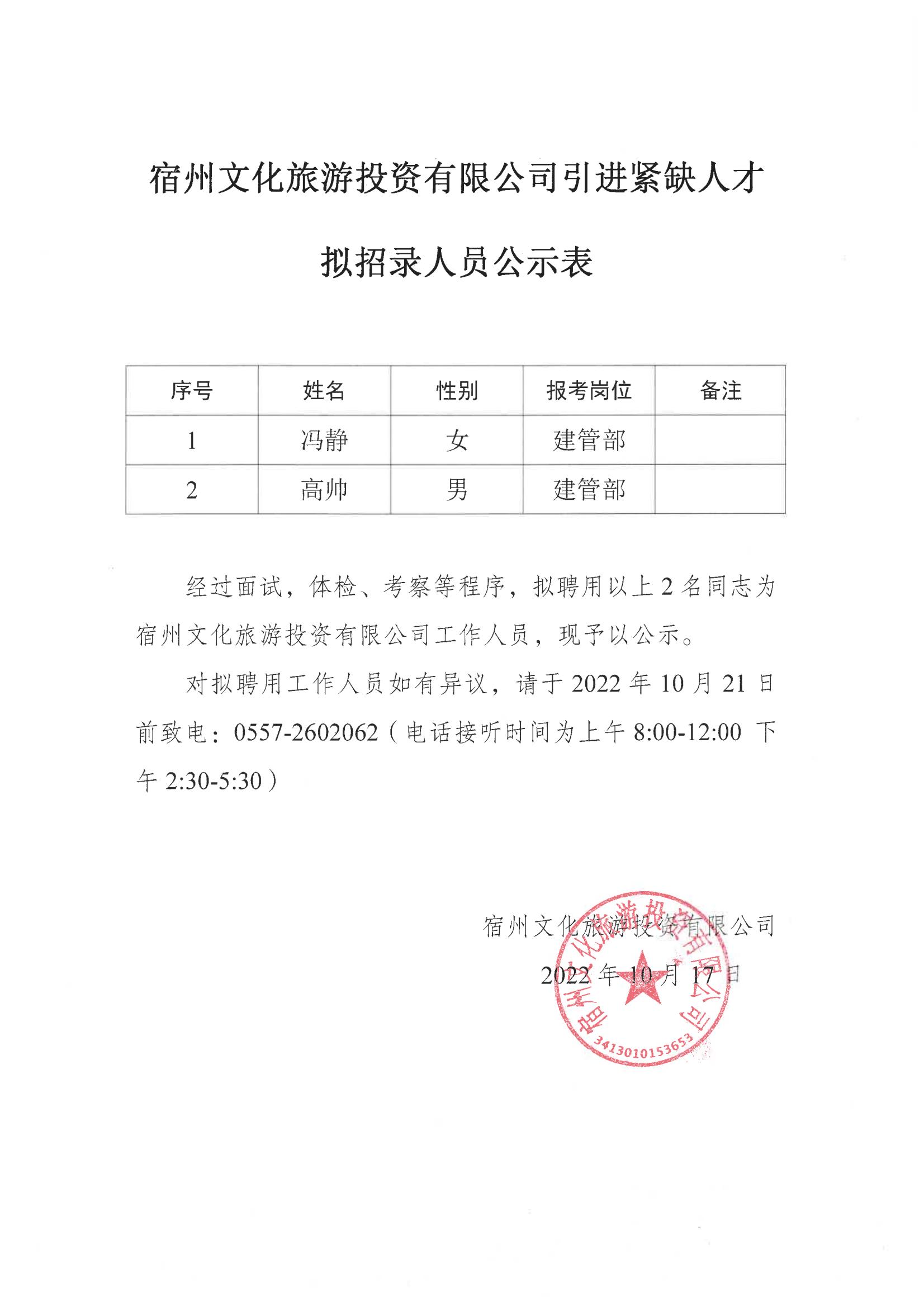 宿州文化旅游投資有限公司引進緊缺人才 擬招錄人員公示表